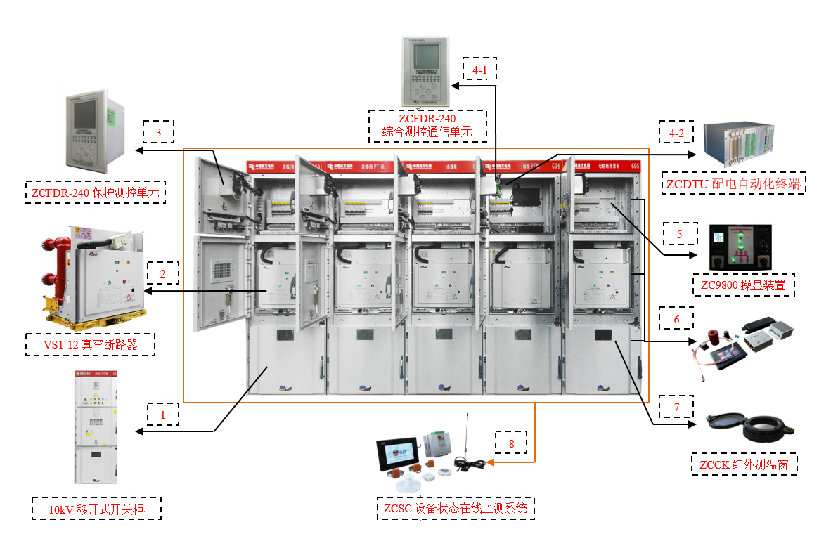 1、 自主品牌一次設(shè)備(KYN27型開關(guān)柜)+二次設(shè)備(ZCFDR-240系列自動化終端)融合產(chǎn)品;