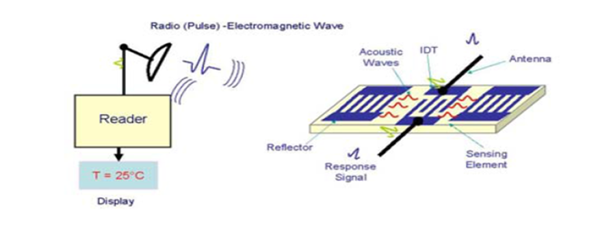 采用特殊設(shè)計(jì)的聲表諧振器(SAW),當(dāng)有一個(gè)固定頻率的電波輸入到聲表諧振器,諧振器輸出的電波信號頻率會(huì)隨著諧振器感受到的環(huán)境溫度的變化而變化,利用它的這個(gè)特性,通過采集諧振器的輸出頻率,就可以換算出諧振器對應(yīng)的環(huán)境溫度,達(dá)到測量環(huán)境溫度的目的。聲表諧振器具有無源、單調(diào)、重復(fù)性好、線性度好的優(yōu)點(diǎn)。